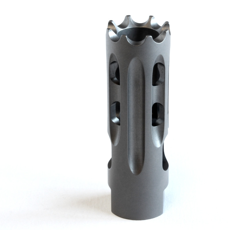 The X4 Titanium brake is a lightweight muzzle device for large bore applications. The X4 was developed with a large initial chamber that provides a reactive surface for gasses to mitigate recoil. The secondary chamber provides some compensating affect as well as flash reduction. The X4 was tuned to provide a softer felt impulse over traditional brakes. With the X4, follow up shot times are reduced as the firearm returns to target much faster, and the chamber design can help eliminate circular rotation, or scope movement on target. The X4 Titanium is a welcome addition to any large bore rifle where weight is a concern.